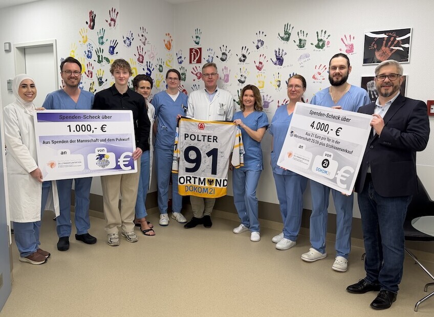 Zwei Spendenschecks in einer Gesamthöhe von 5.000 € haben die kommunale 21-Gruppe und die Eisadler Dortmund an das Centrum für Zelltransplantation am Klinikum Dortmund übergeben.