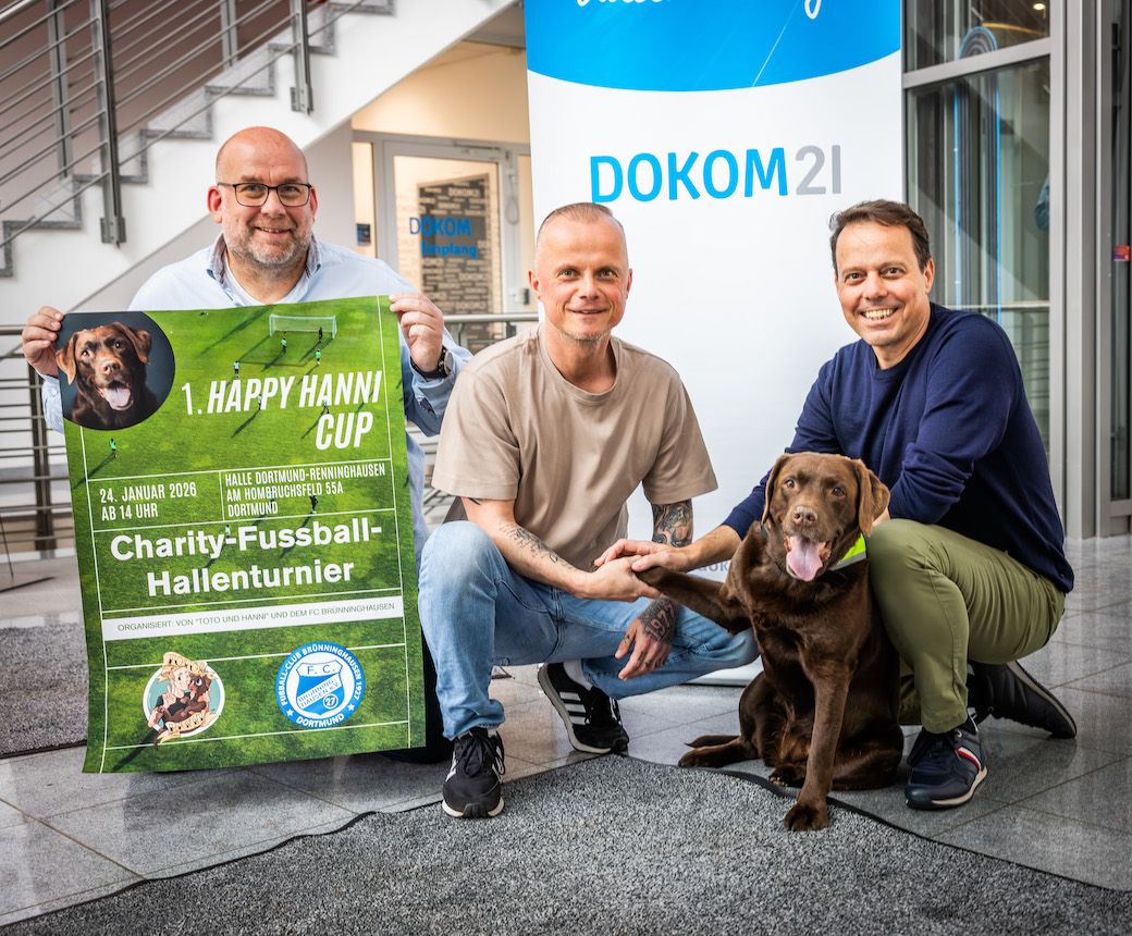 Der Happy Hanni Cup ist ein Charity-Fußball-Hallenturnier, das nicht nur für sportliche Highlights sorgt, sondern vor allem Herzen bewegt. Hinter dem Turnier stehen Thorsten Habel, seine Assistenzhündin Hanni und der Fußballverein FC Brünninghausen. Als das bekannte Duo “Toto und Hanni” engagieren sich die beiden bundesweit dafür, das Thema Assistenzhunde stärker ins öffentliche Bewusstsein zu rücken. Habel selbst leidet an einer seltenen Erkrankung, die nur wenige Menschen in Deutschland betrifft. DOKOM21 unterstützt das Charity-Fußball-Hallenturnier mit einer Spende von 1.500 Euro und einem Trikotsatz für das Team „Toto & Friends“ inklusive Druck und Logopräsenz. Außerdem hat DOKOM21 eine zusätzliche Spende von 1.000 Euro zugesagt, wenn das Team „Toto & Friends“ das Turnier gewinnt.